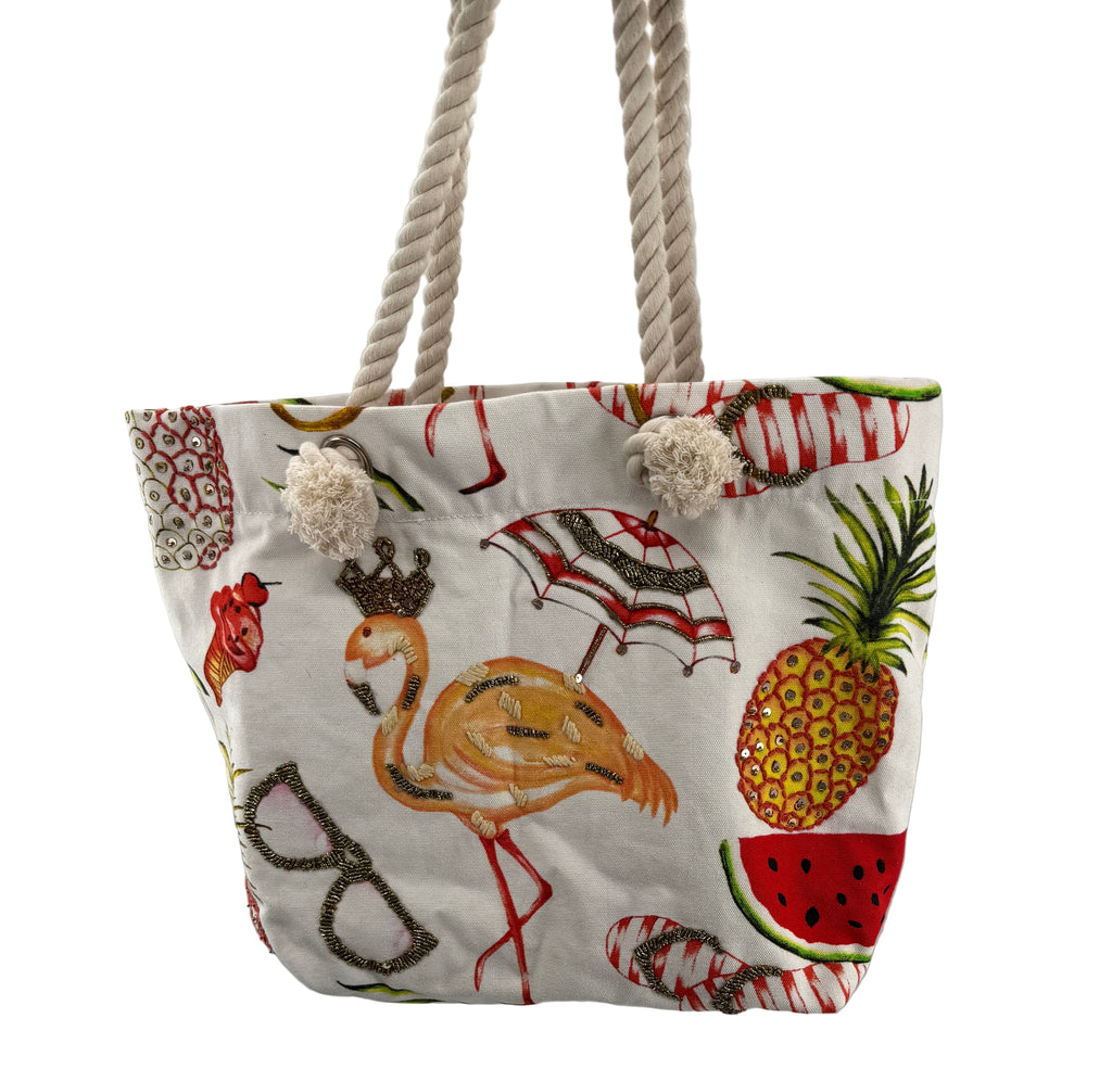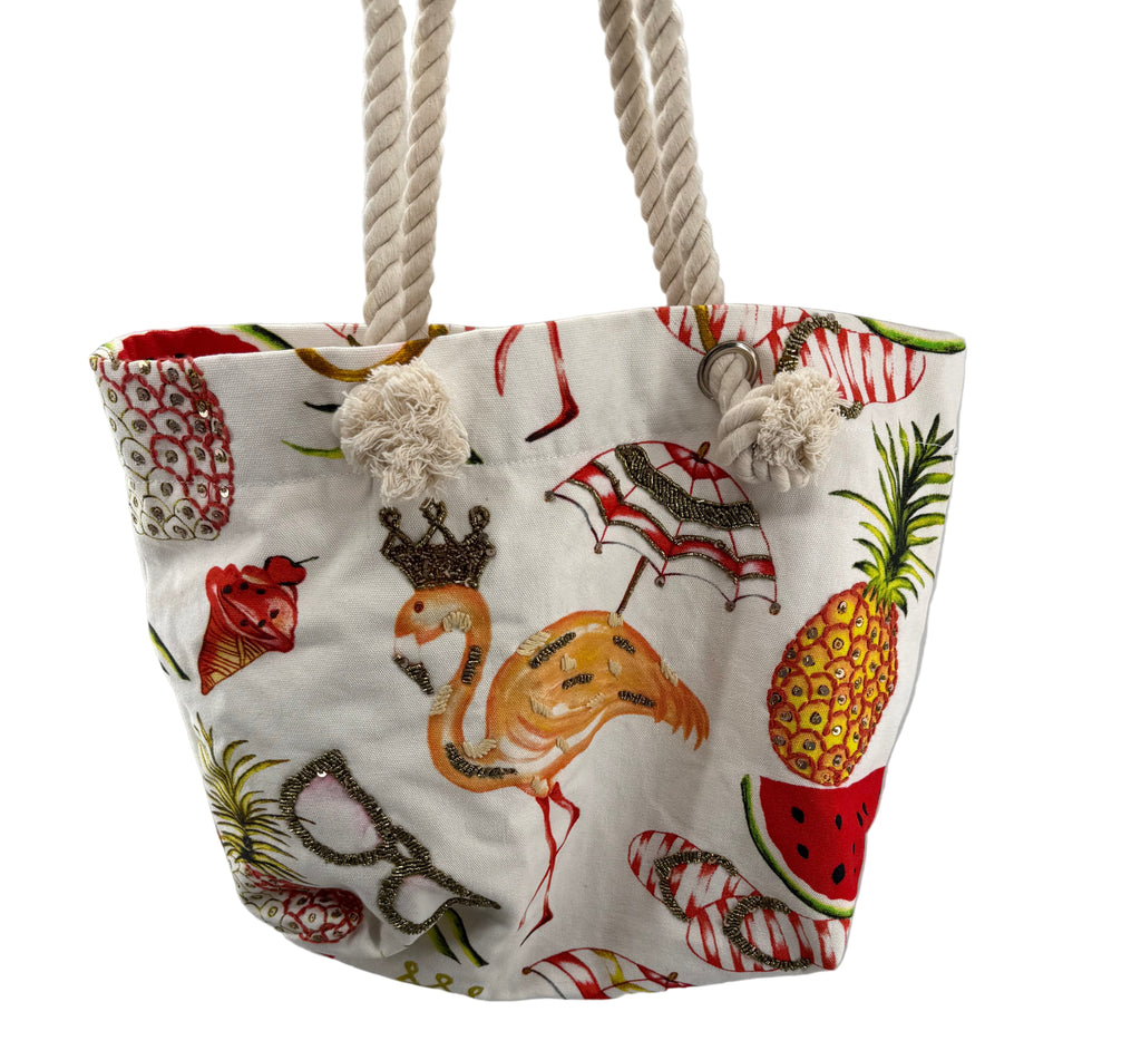 Made In India Beaded Flamingo Beach Everyday Rope Handles Tote Bag*
