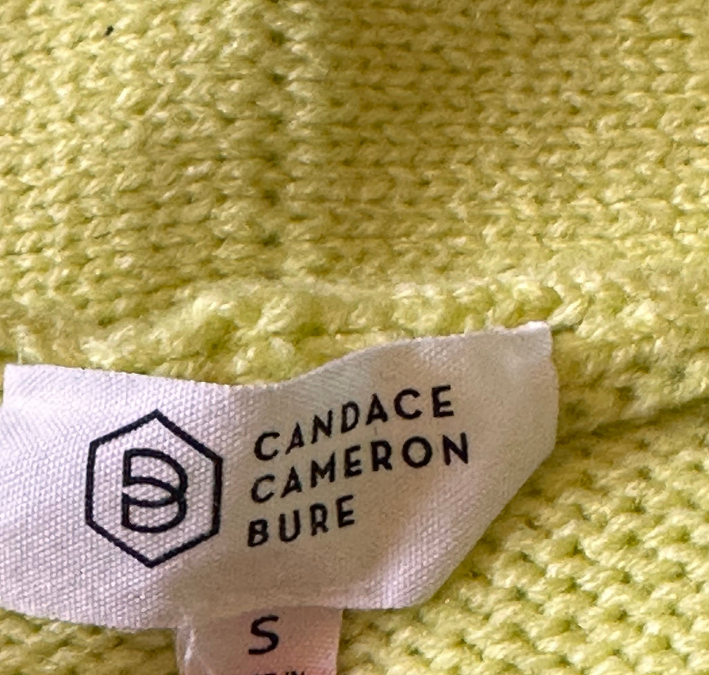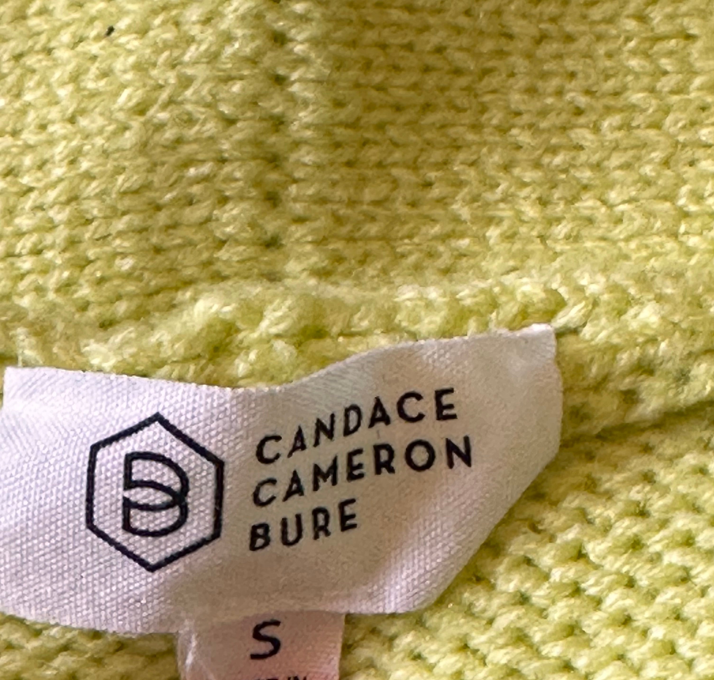 This Candace Cameron Bure Neon Yellow Knit Cardigan is preloved and comes in a size small. With a chest measurement of 42 inches, sleeve length of 21 inches, and overall length of 29 inches, this cardigan is a comfortable and stylish addition to any wardrobe. Stay cozy and fashionable with this one-of-a-kind piece.