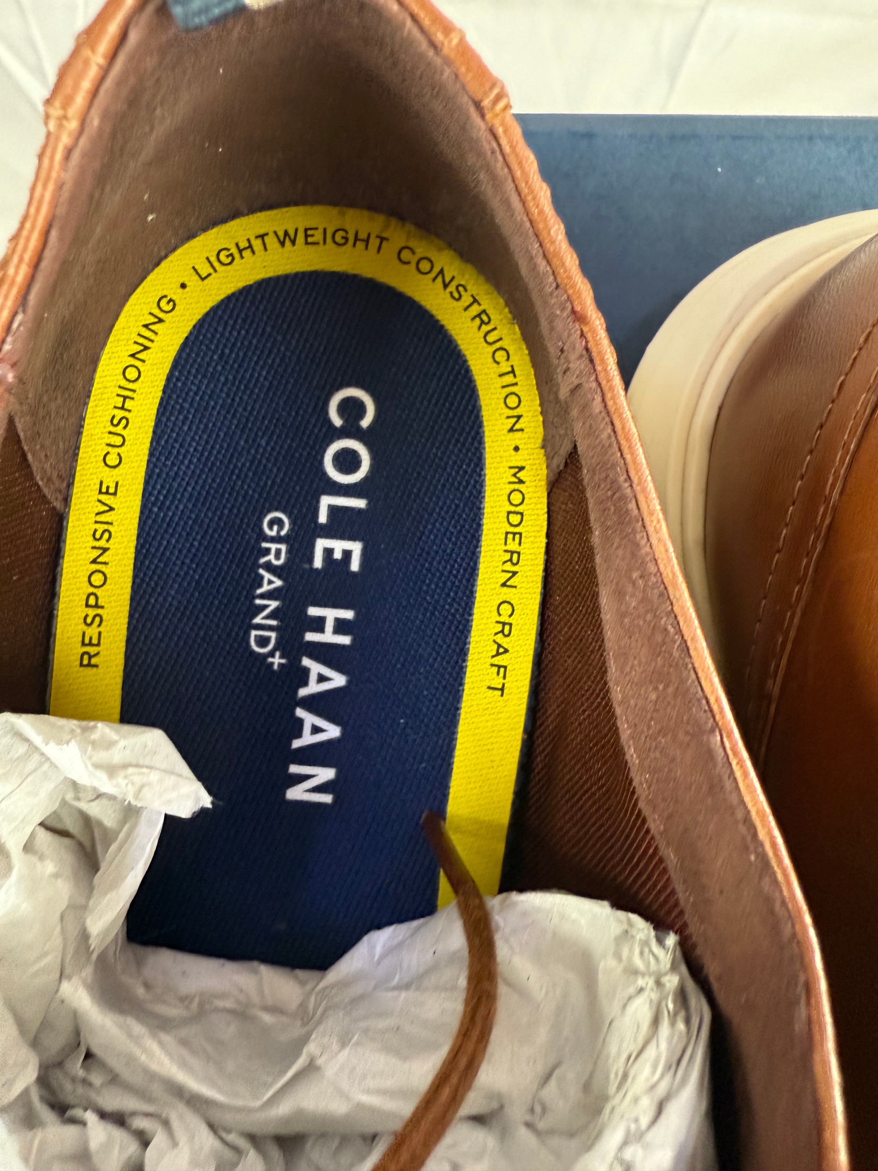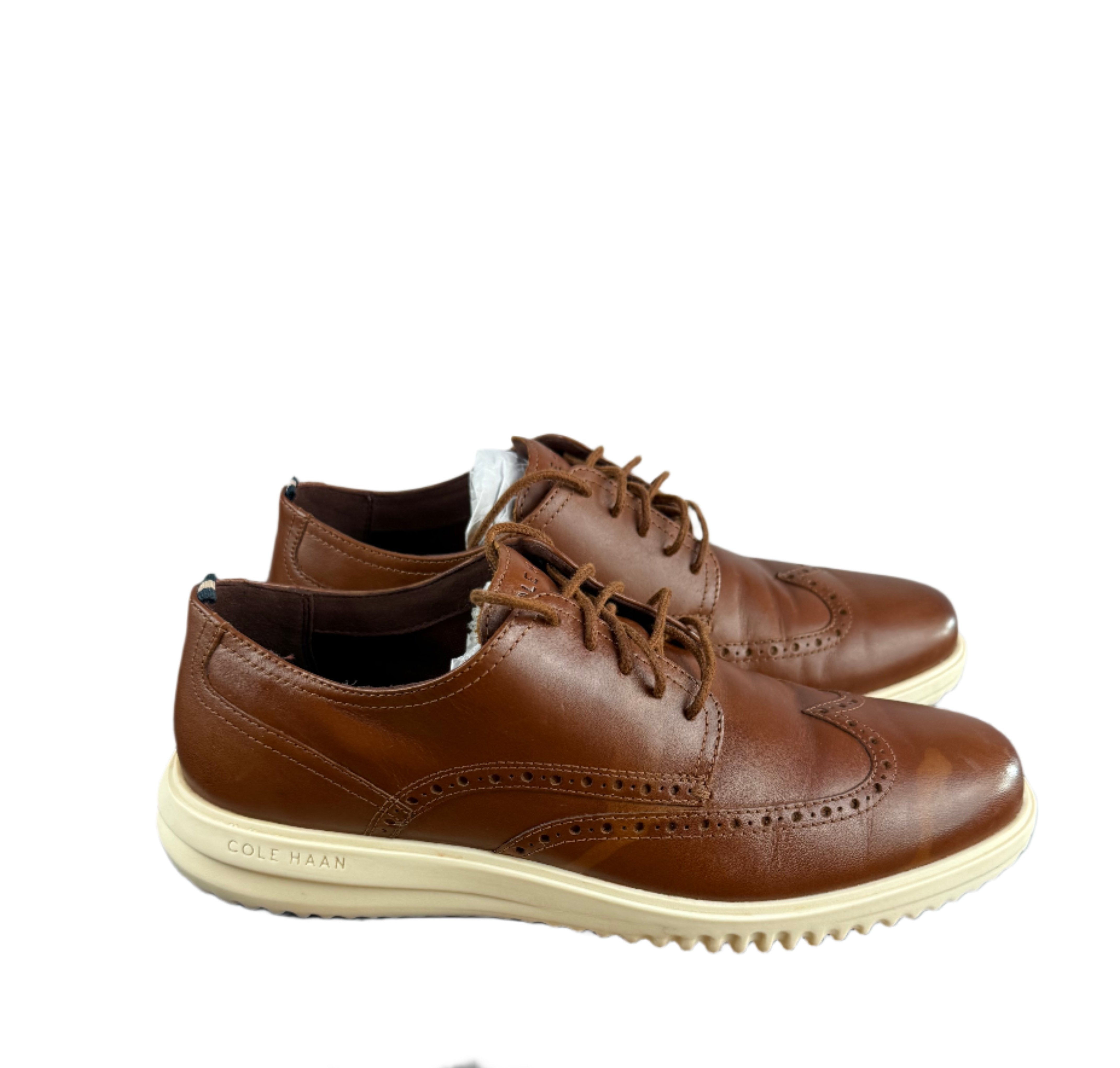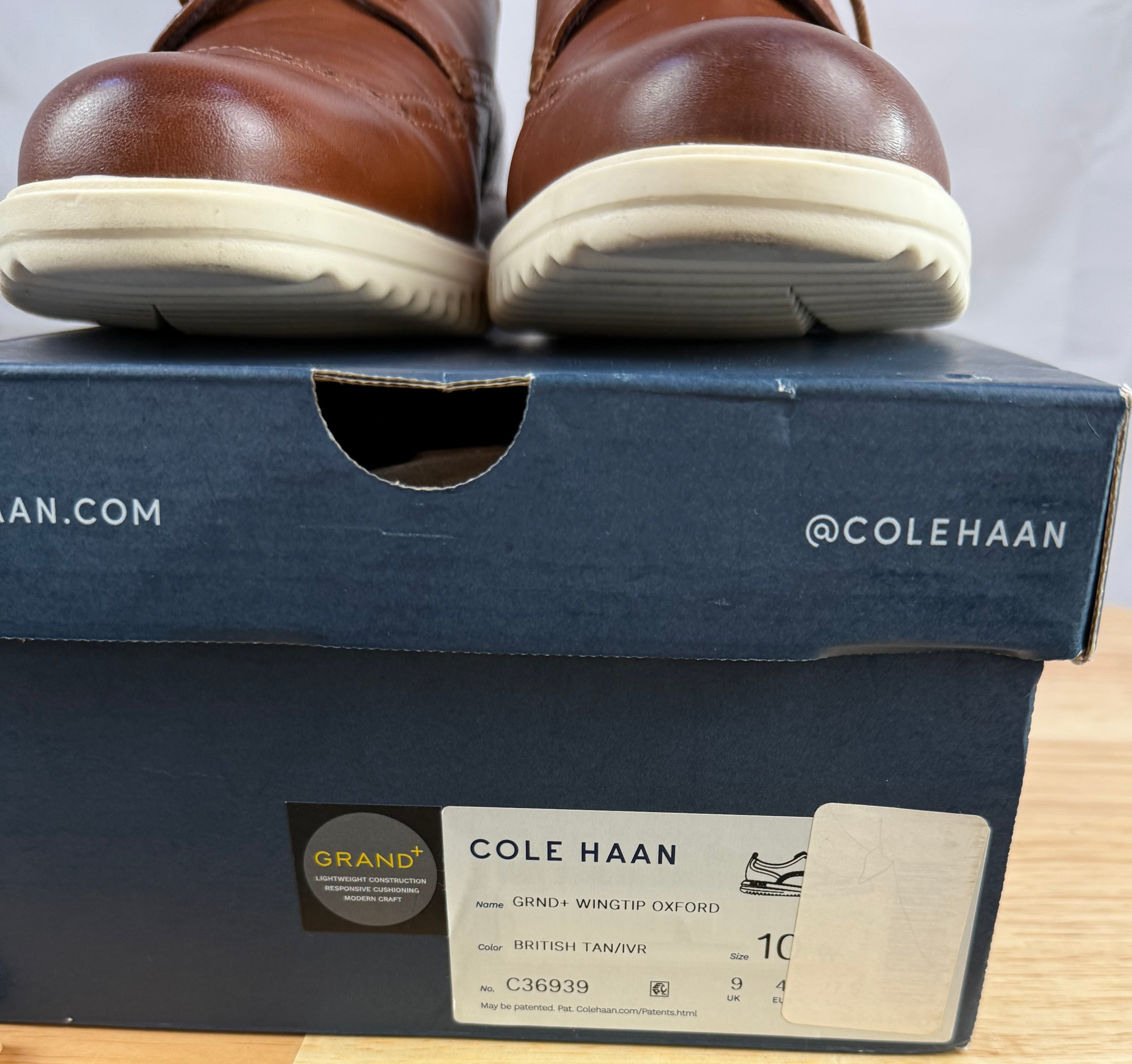 Expertly crafted with premium leather, the Cole Haan Grand+ Wingtip Oxford provides unmatched comfort for all-day wear. This floor sample in British Tan, size 10, comes with the original box. Elevate your style and step out in confidence.