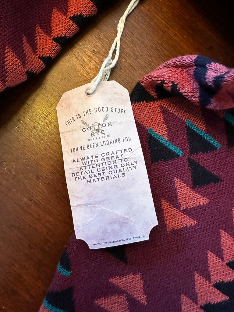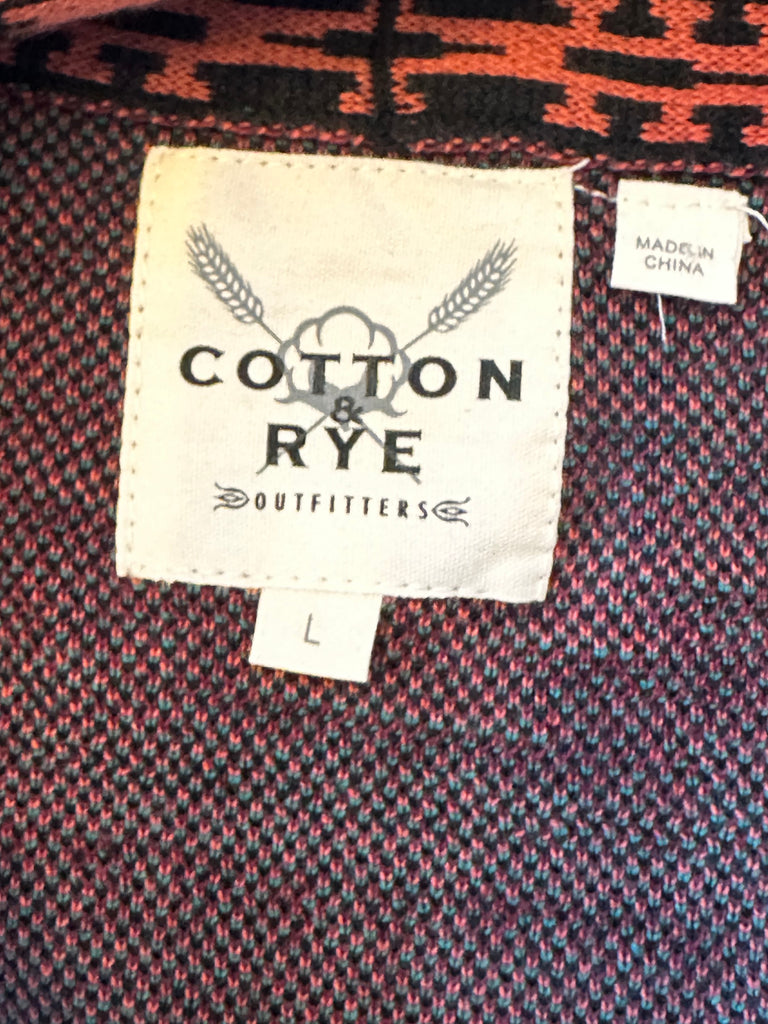 This Western-inspired knit cardigan by Cotton & Rye features a stylish tassel tie closure and generous proportions with a 42" chest, 24" sleeve length, and 33" overall length. The large size offers a comfortable fit while maintaining the authentic Western aesthetic. New with tags, this piece combines traditional design elements with practical wearability.