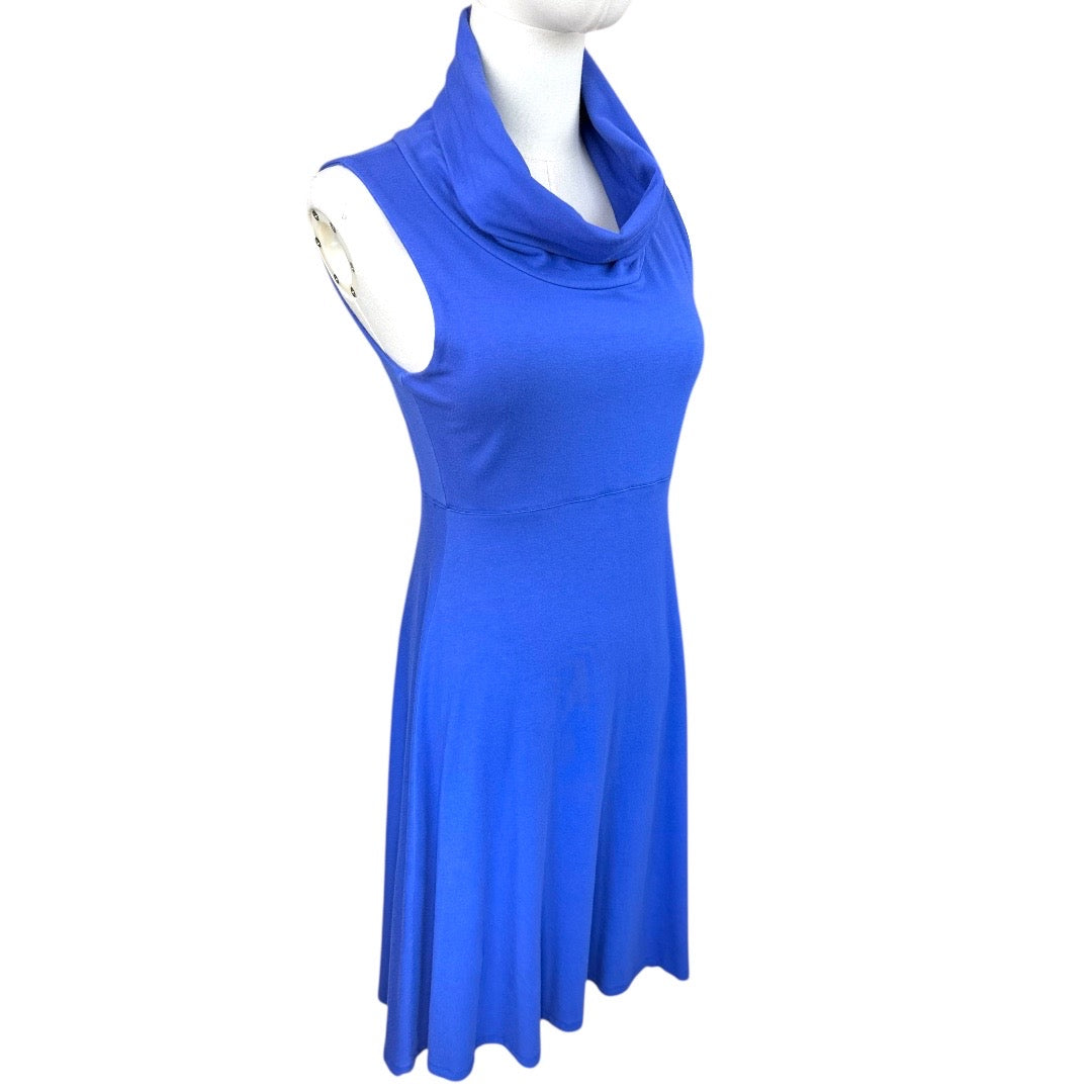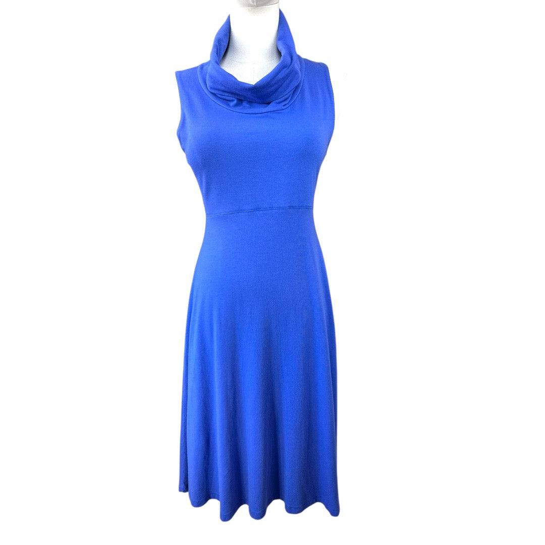 This preloved women's activewear dress in a vibrant outdoor blue features a breathable bamboo viscose blend fabric, offering natural softness and moisture-wicking properties. Designed with a flattering cowl neck and sleeveless cut, it provides both style and comfort for active or casual wear. With a chest measurement of 30" and a length of 37", this medium-sized dress ensures a tailored fit ideal for movement and ease throughout your day.
