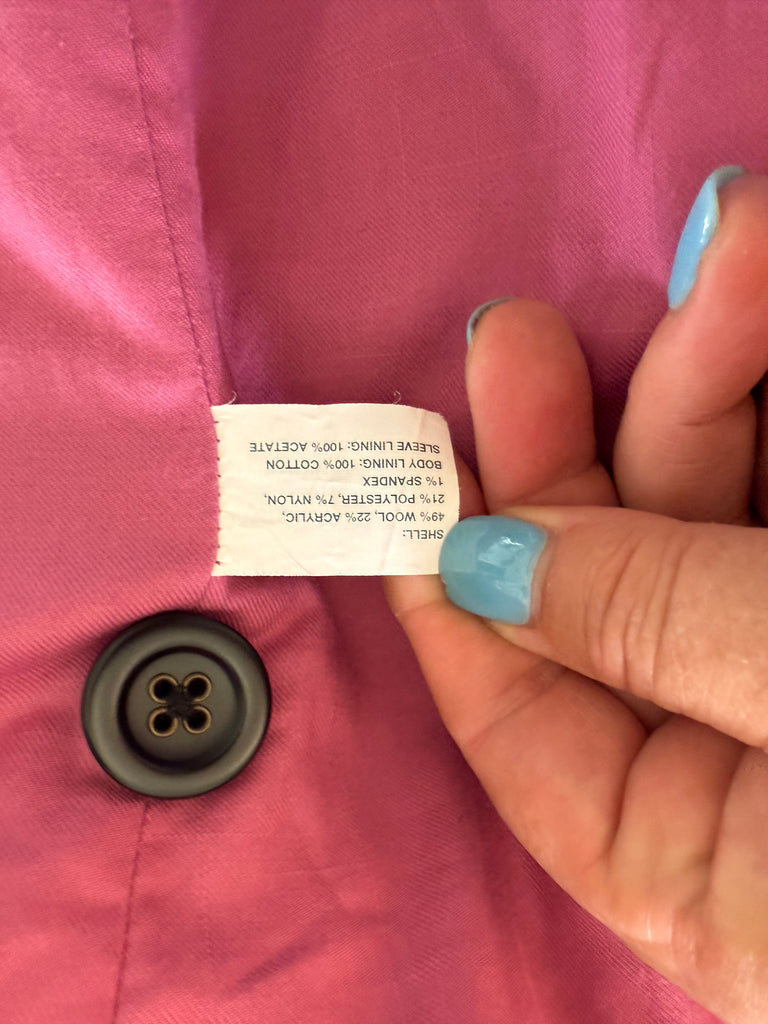 This GAP women's blazer combines a wool-cotton blend for warmth and breathability with a smooth polyester lining that ensures comfortable wear. Featuring a classic pink and black tweed pattern and a tailored four-button design, it offers both style and structure, perfect for professional or refined casual occasions. Its medium size provides a flattering fit while maintaining a polished look.