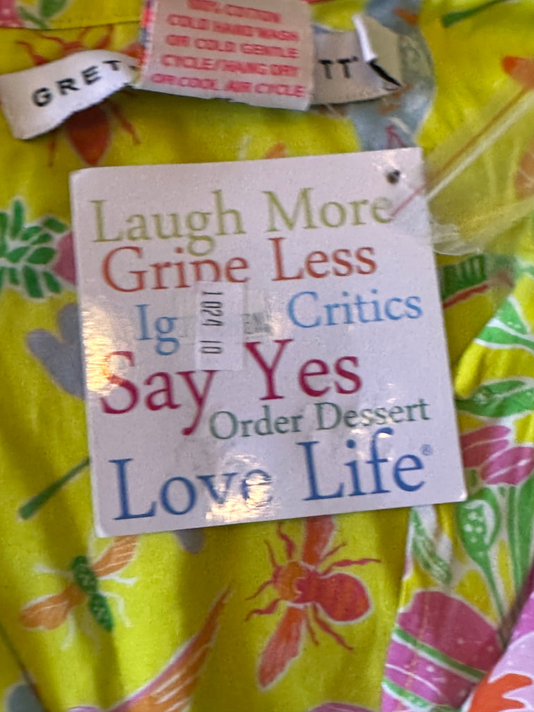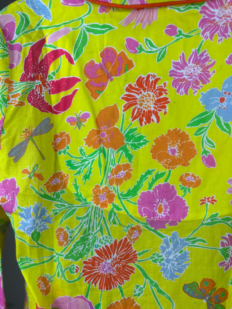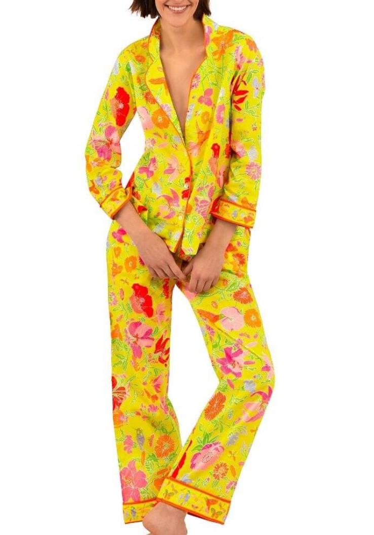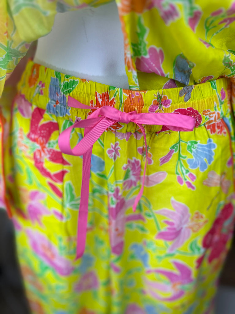 With its 100% cotton fabric, comfortable drawstring waist, and delicately detailed piping, the Gretchen Scott The Birds and The Bees Pajama Set offers both style and comfort for a peaceful night's sleep. Stay cool and cozy in this expertly crafted pajama set. Top: Chest 36", Length 24", Sleeve 19", Bottom Waist 25", Inseam 27".