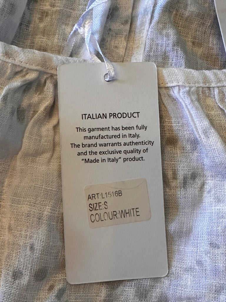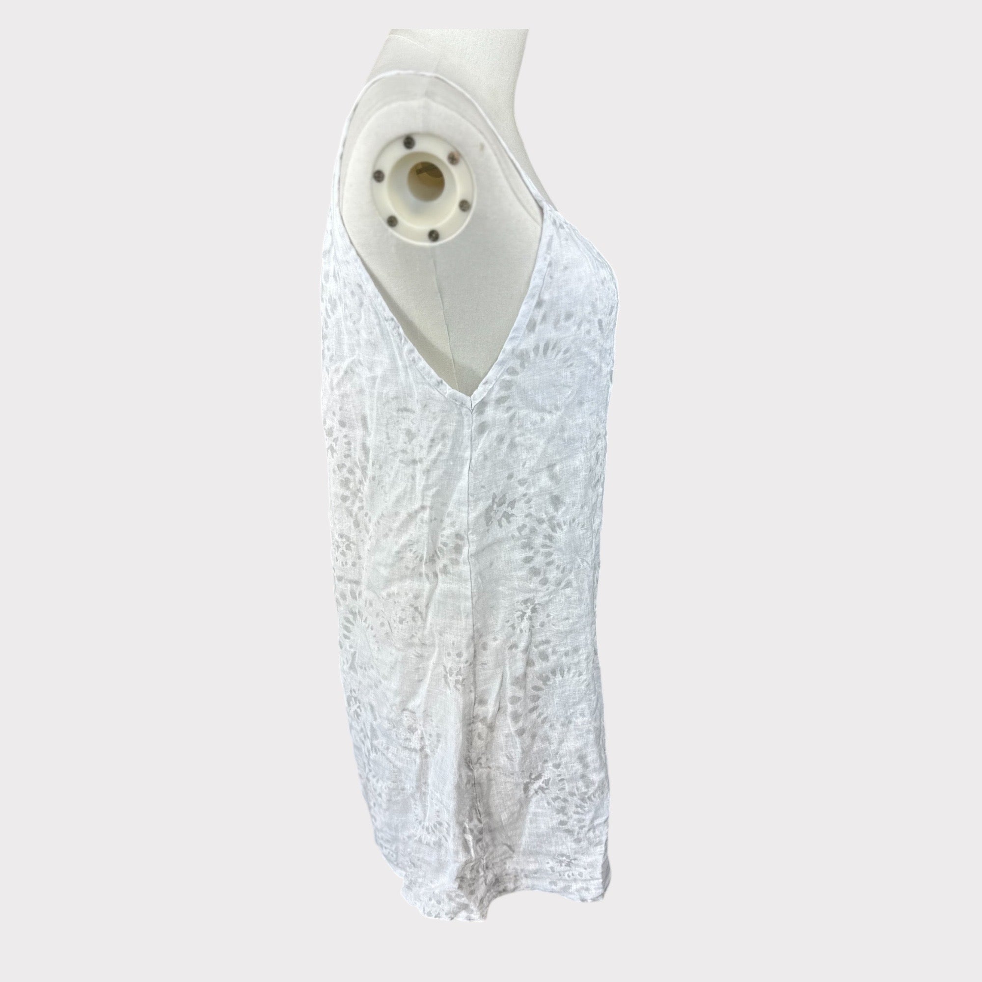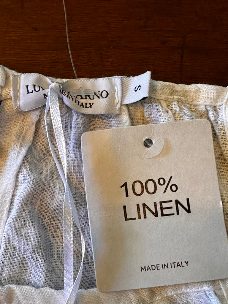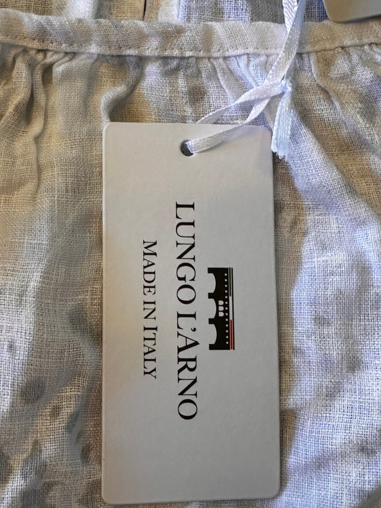 This premium 100% linen tank top from Lungo L'Arno exemplifies authentic Italian craftsmanship. Sized Small with a 36" chest and 32" length, it offers an ideal fit for a relaxed yet refined silhouette. The pristine white fabric ensures versatility while the pure linen construction provides superior breathability and natural temperature regulation, perfect for warm-weather comfort with enduring elegance.