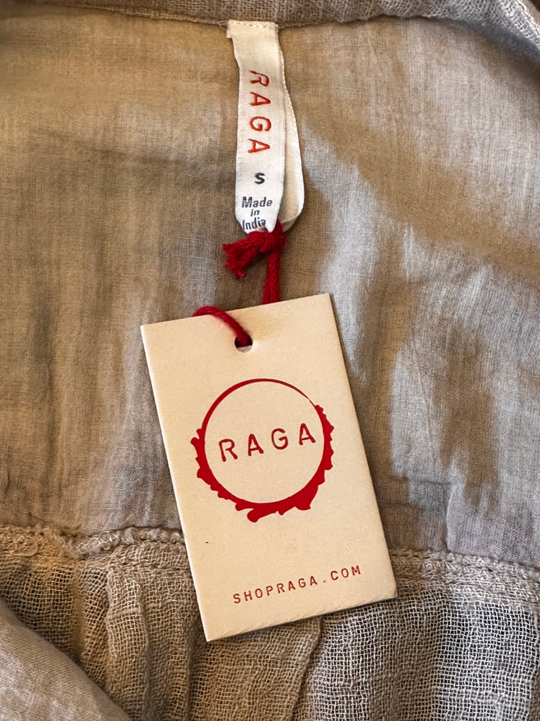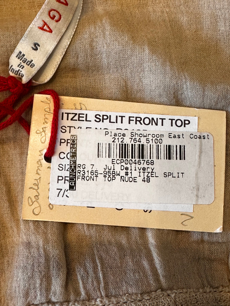 Expertly crafted from high-quality cotton, the Raga Itzel Spilt Front Womens Top combines comfort and style. Made in India, this top offers a touch of elegance and durability. Perfect for any occasion, it is sure to be a staple in your wardrobe. Measurements: Bust 24", Sleeve 15, Length 20". Floor Sample/New with Tags.