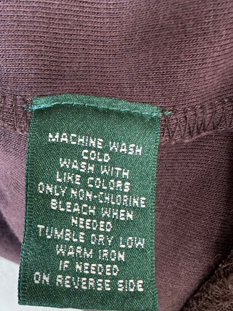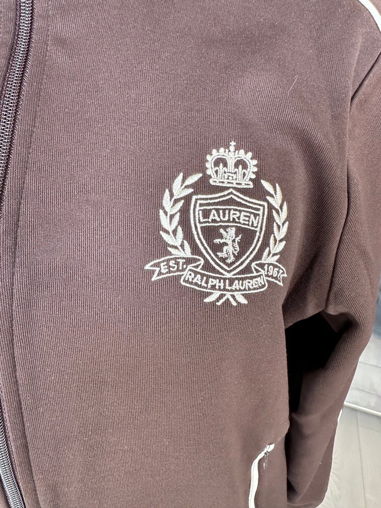 This Ralph Lauren active track jacket is made with a comfortable cotton/poly blend that allows for a perfect fit. Featuring a full zip and embroidered crest, this vintage chocolate brown track jacket is both stylish and functional. With its chest measurement of 42" and length of 26", it's the perfect choice for any active woman, providing both comfort and style. *2Sistahs Take2 Collection-Vintage/Preloved.