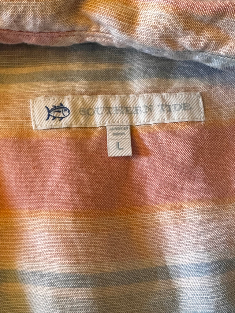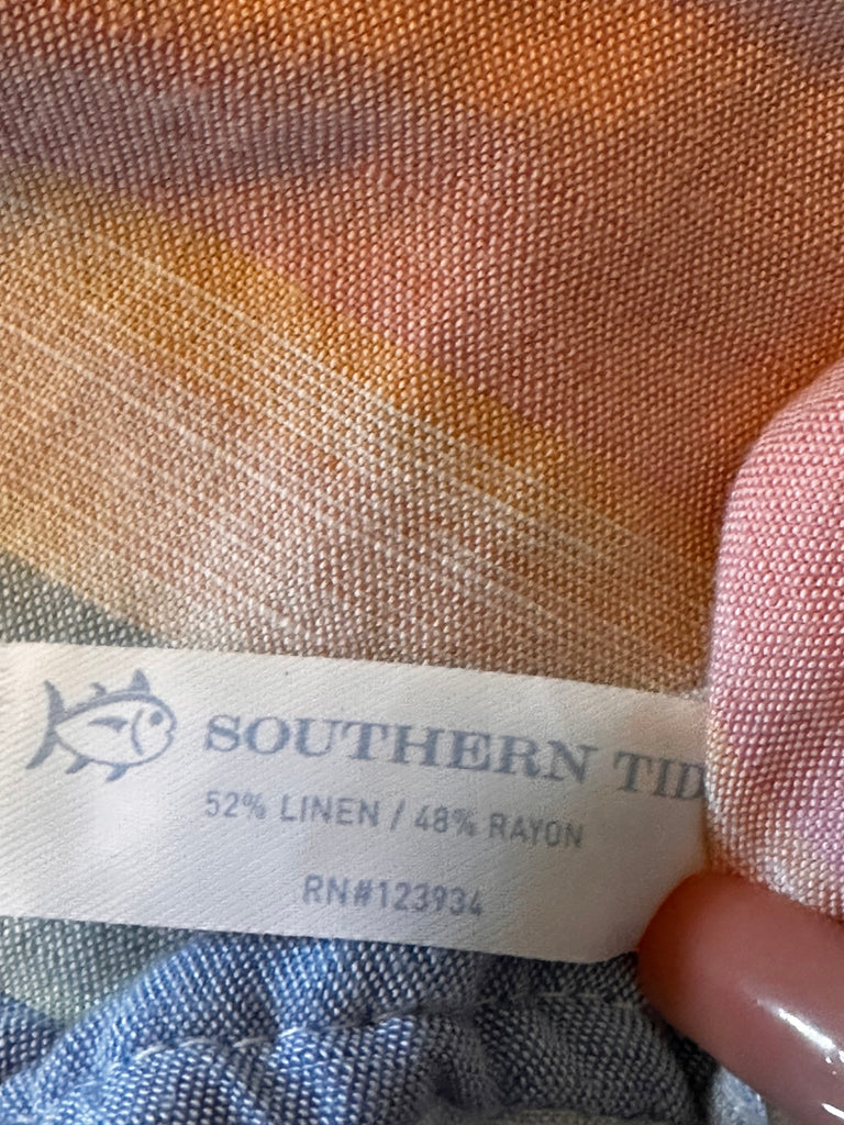 This Southern Tide mini shirt dress, crafted from a breathable linen-cotton blend, offers a comfortable fit with a chest measurement of 44", waist 38", and a length of 36". Its pink and blue stripes provide a classic, preppy look ideal for warm weather. Designed in a preloved large size, it combines style and sustainability for a versatile addition to your wardrobe.