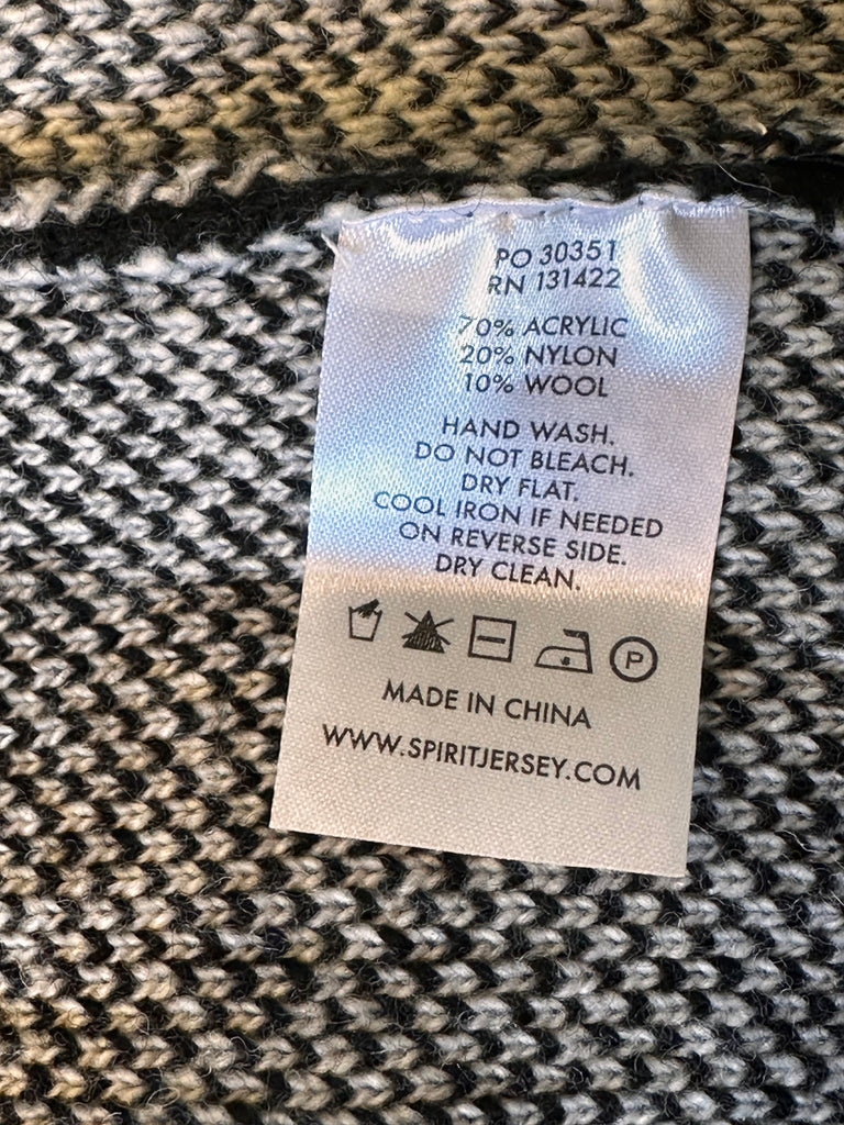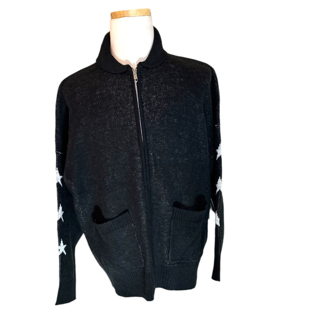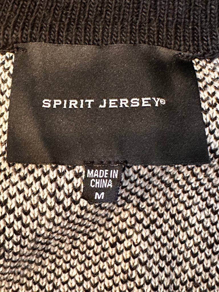 Expertly crafted with a blend of arcrylic, poly, and wool, the Spirit Jersey Black Full Zip Far Out Unisex Sweater offers ultimate style and comfort. With a chest size of 48 inches, a length of 28 inches, and sleeves measuring 18 inches, this versatile sweater is perfect for any occasion. New with tags.