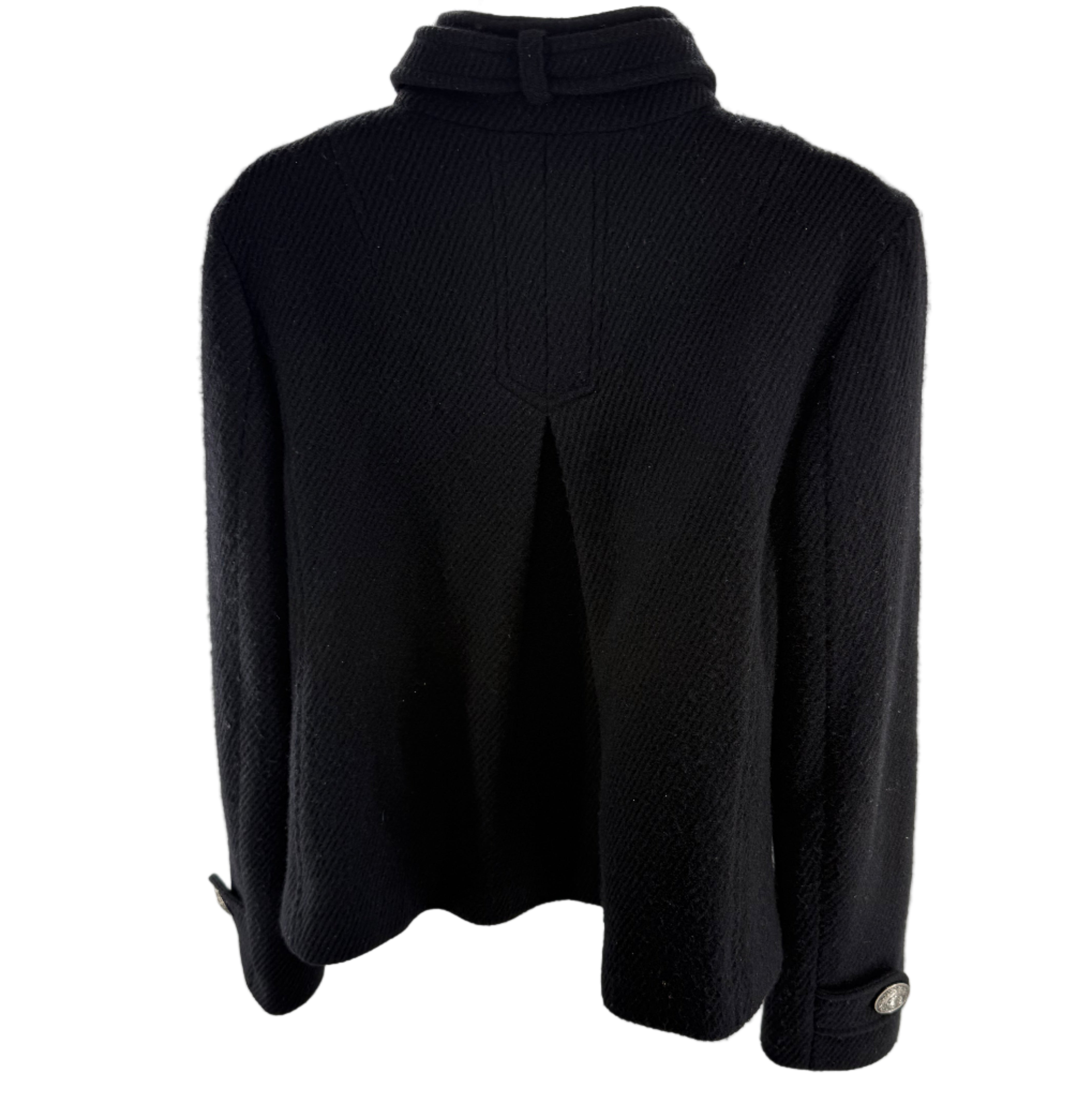 This Steve Madden black wool pea coat features a classic double-breasted design enhanced by distinctive silver buttons that add a refined touch. Fully lined for added warmth and comfort, it combines timeless style with practical functionality, making it an excellent choice for cooler weather in medium sizes.