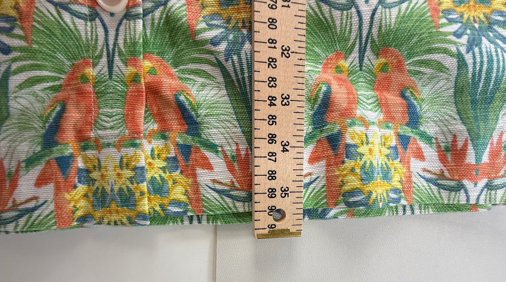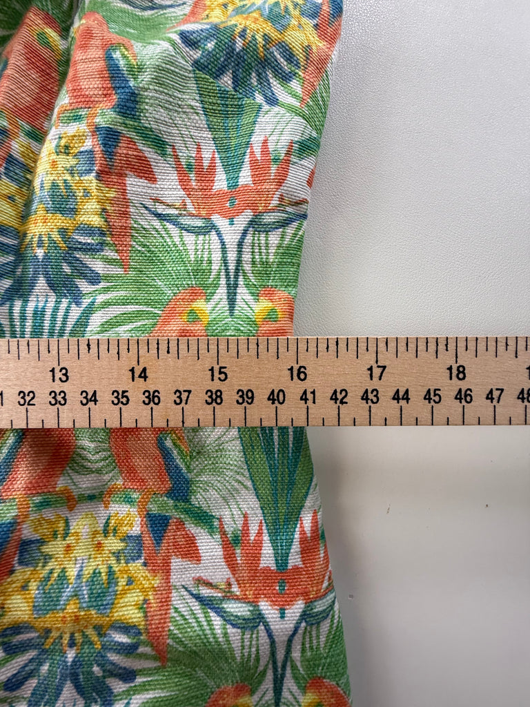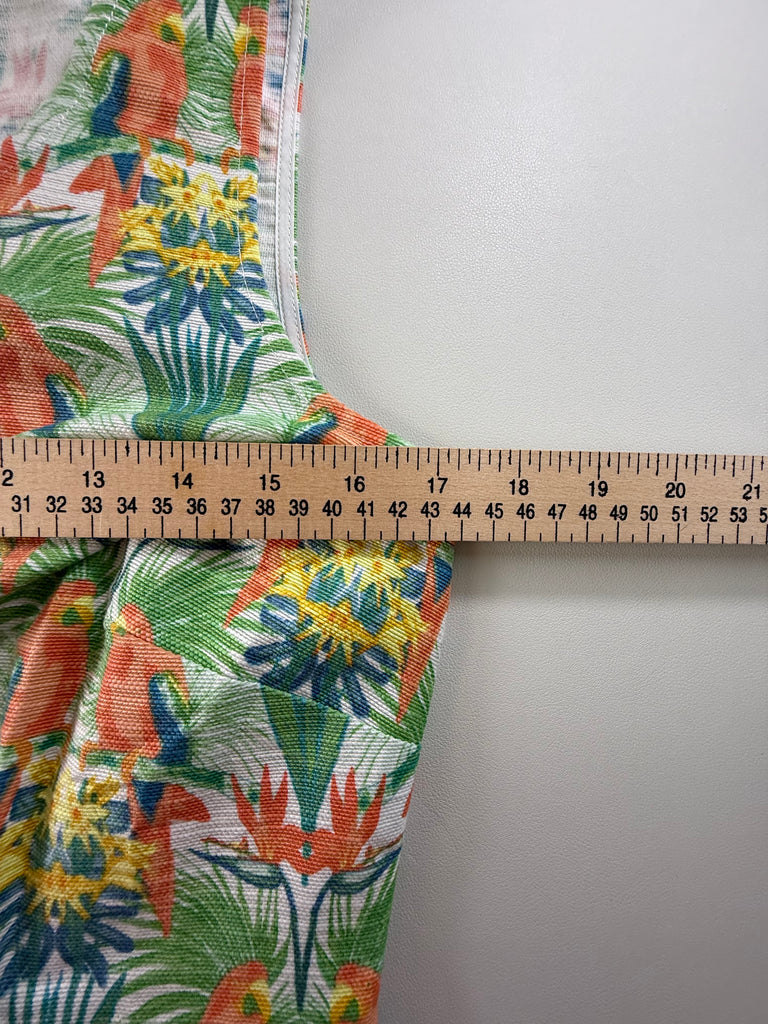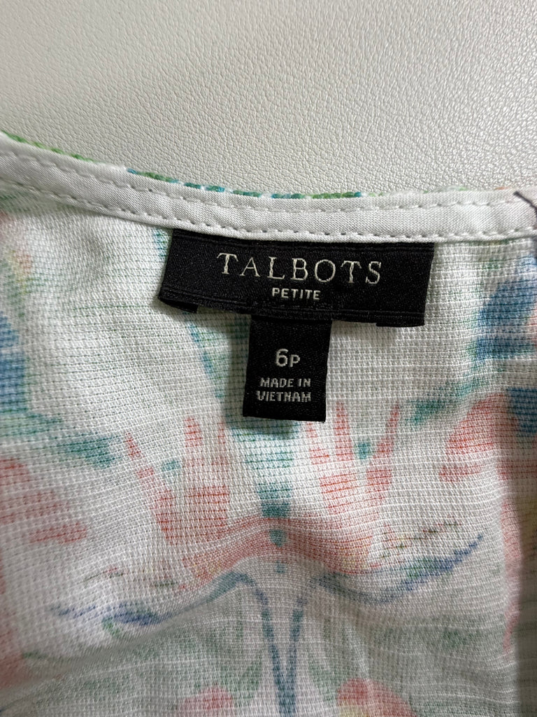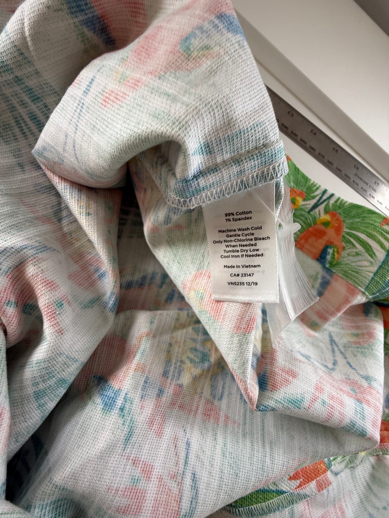 This Talbots Hawaiian sheath dress in size 6 Petite combines breathable cotton with a touch of spandex for comfortable stretch and shape retention. The vibrant parrot print adds island-inspired flair, while the zipper back ensures a smooth, tailored fit. Ideal for warm weather occasions, this dress offers a classic silhouette with expert craftsmanship.