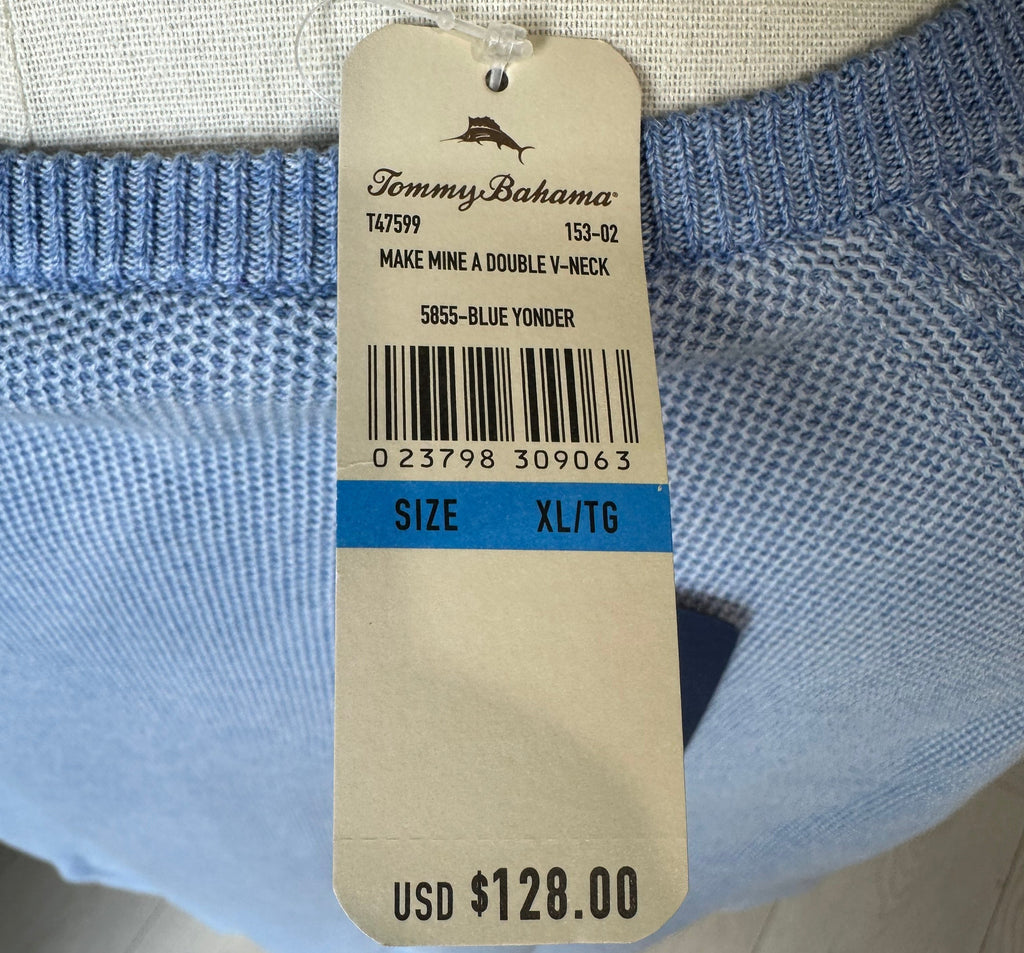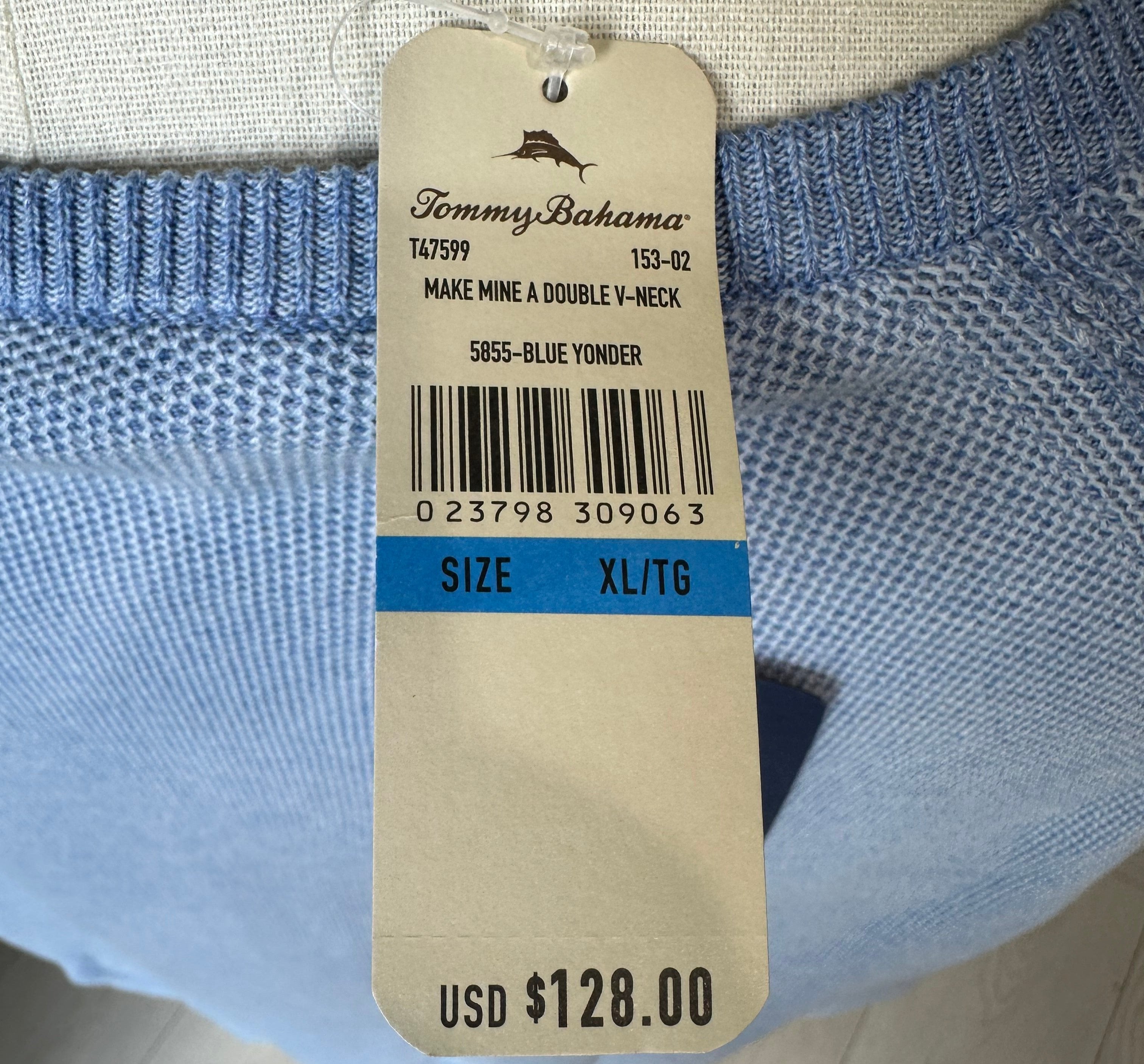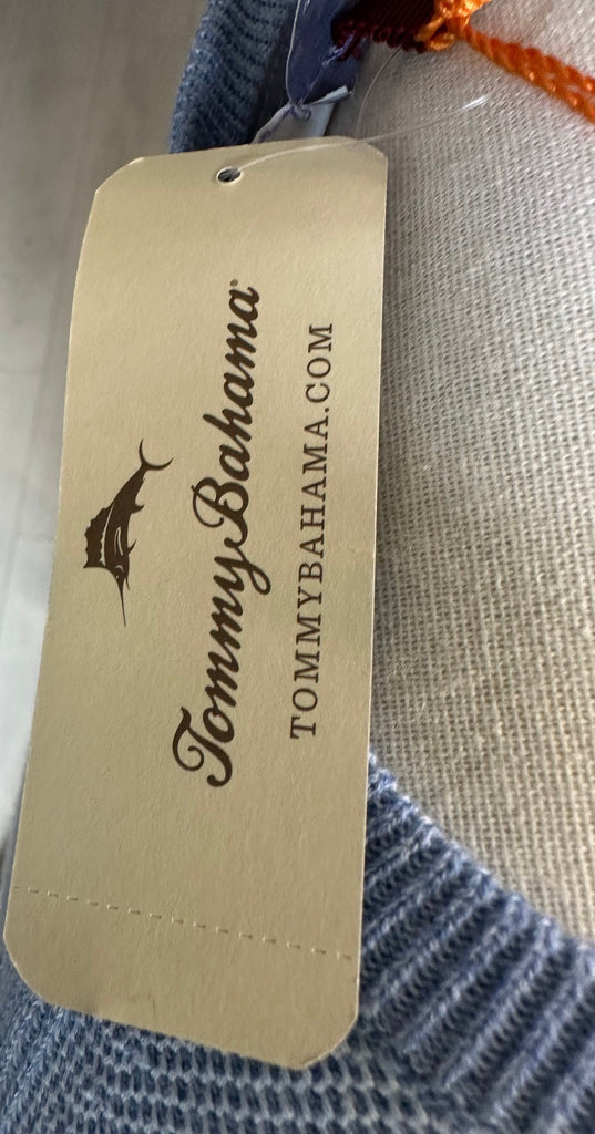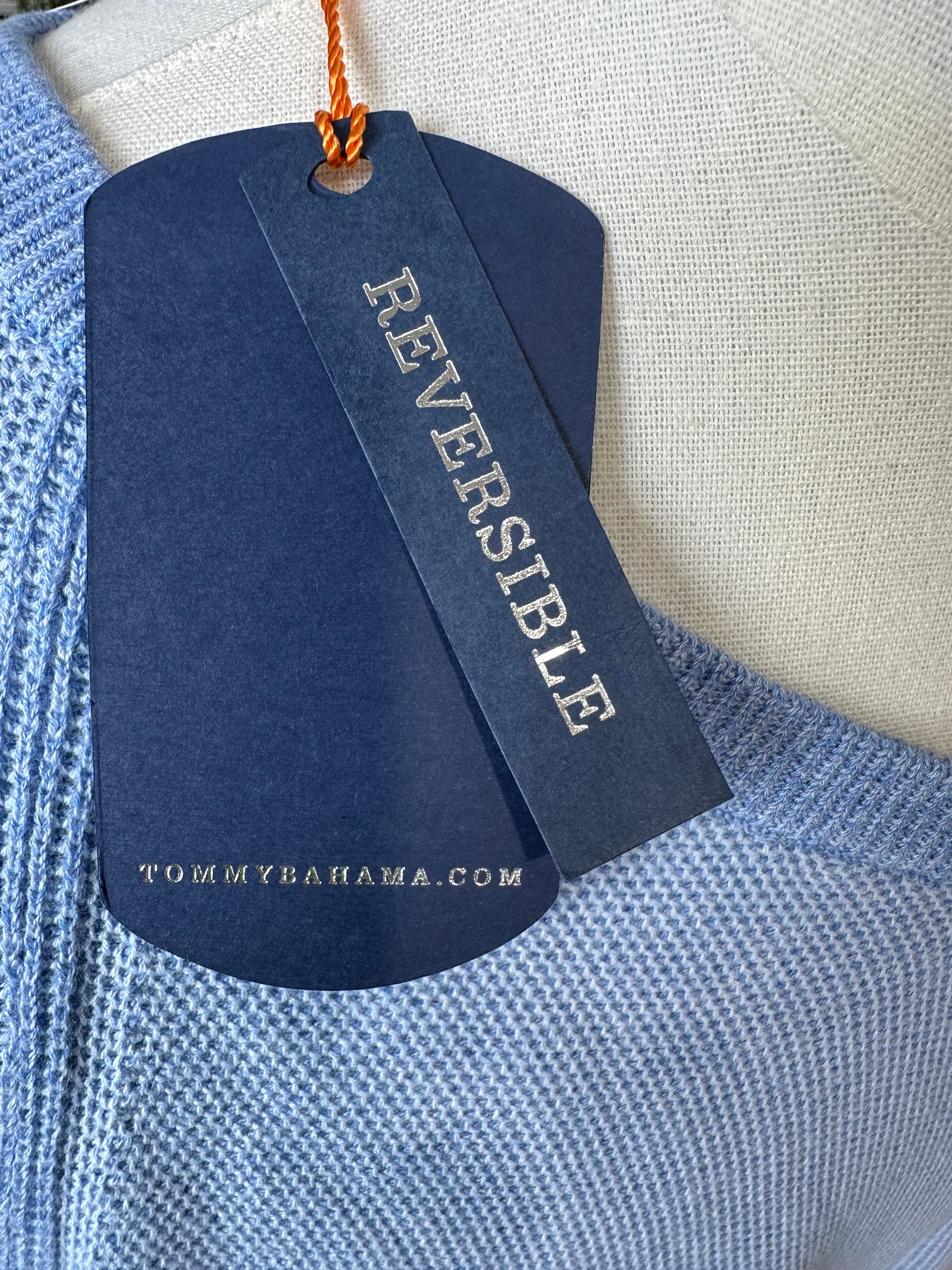This Tommy Bahama Blue Yonder Mens VNeck Reversible Sweater is made from 100% Pima Cotton, providing a soft and luxurious feel. Its reversible design offers versatility, making it a perfect addition to any wardrobe. Stay comfortable and stylish with this expertly crafted sweater. New with tags. Measurements: Chest 46", Length 30".