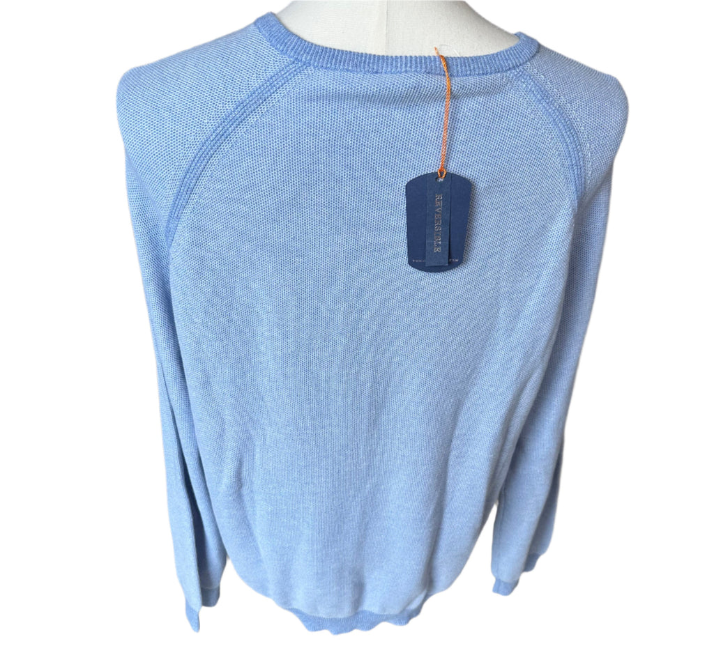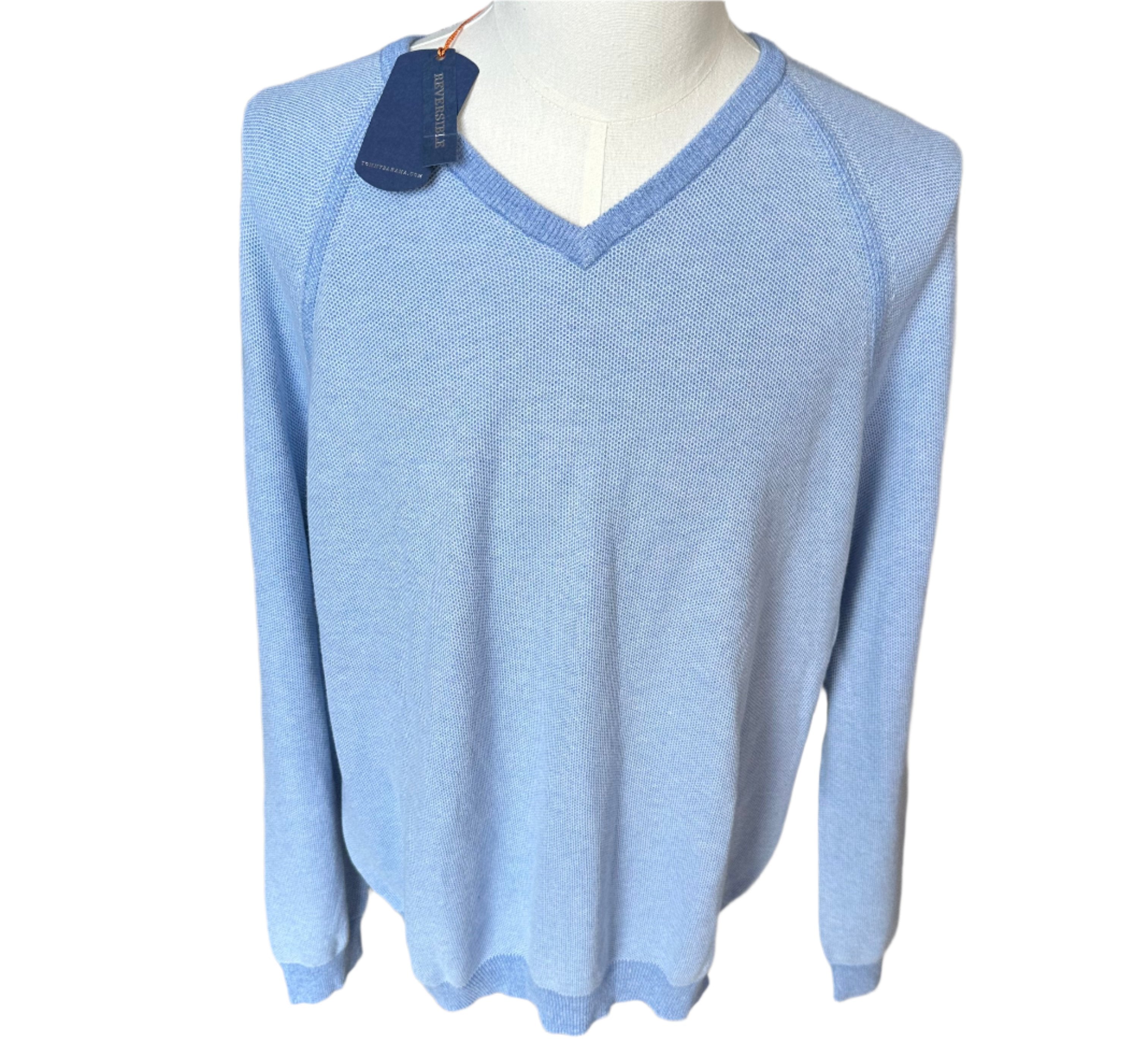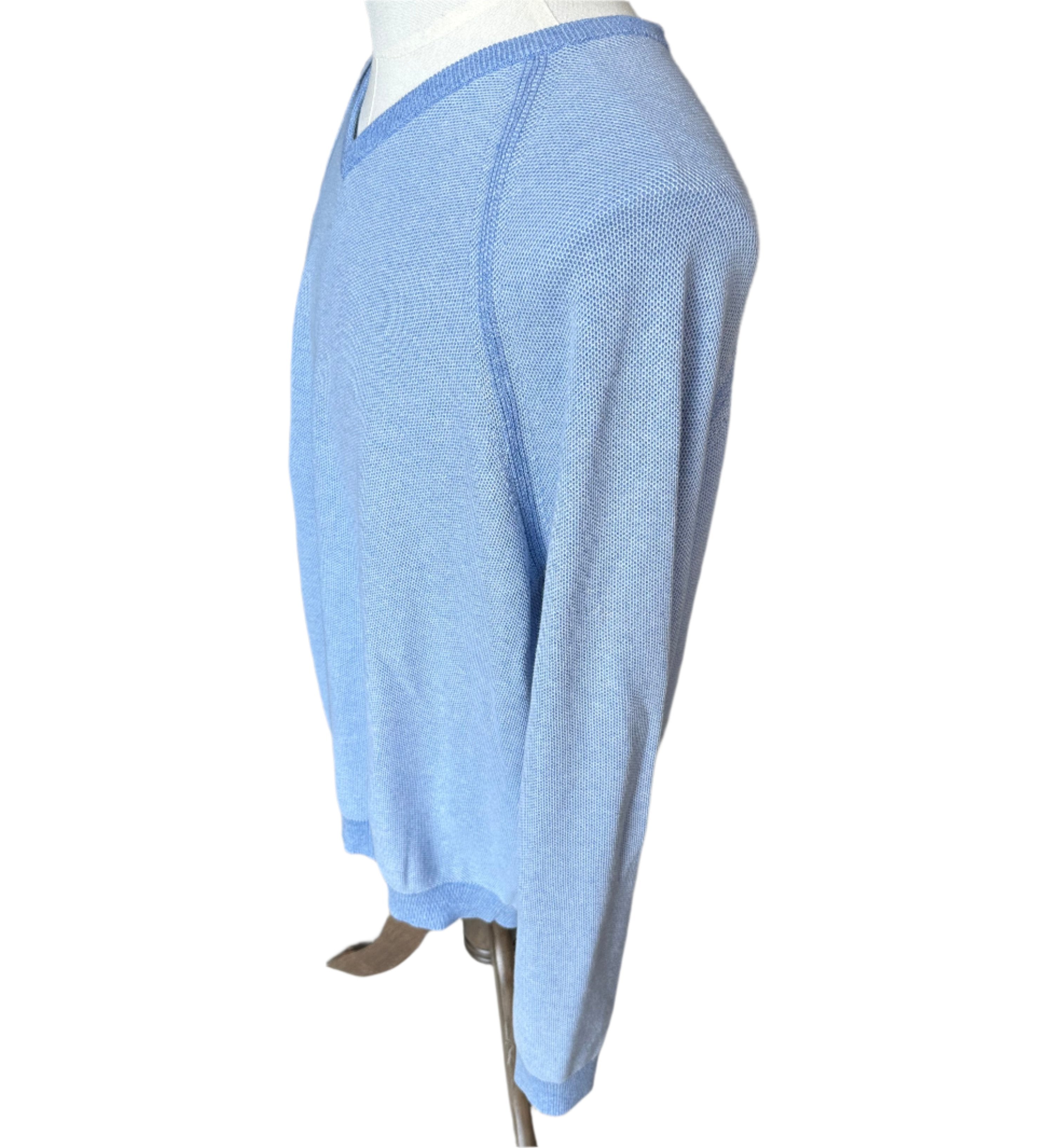 This Tommy Bahama Blue Yonder Mens VNeck Reversible Sweater is made from 100% Pima Cotton, providing a soft and luxurious feel. Its reversible design offers versatility, making it a perfect addition to any wardrobe. Stay comfortable and stylish with this expertly crafted sweater. New with tags. Measurements: Chest 46", Length 30".